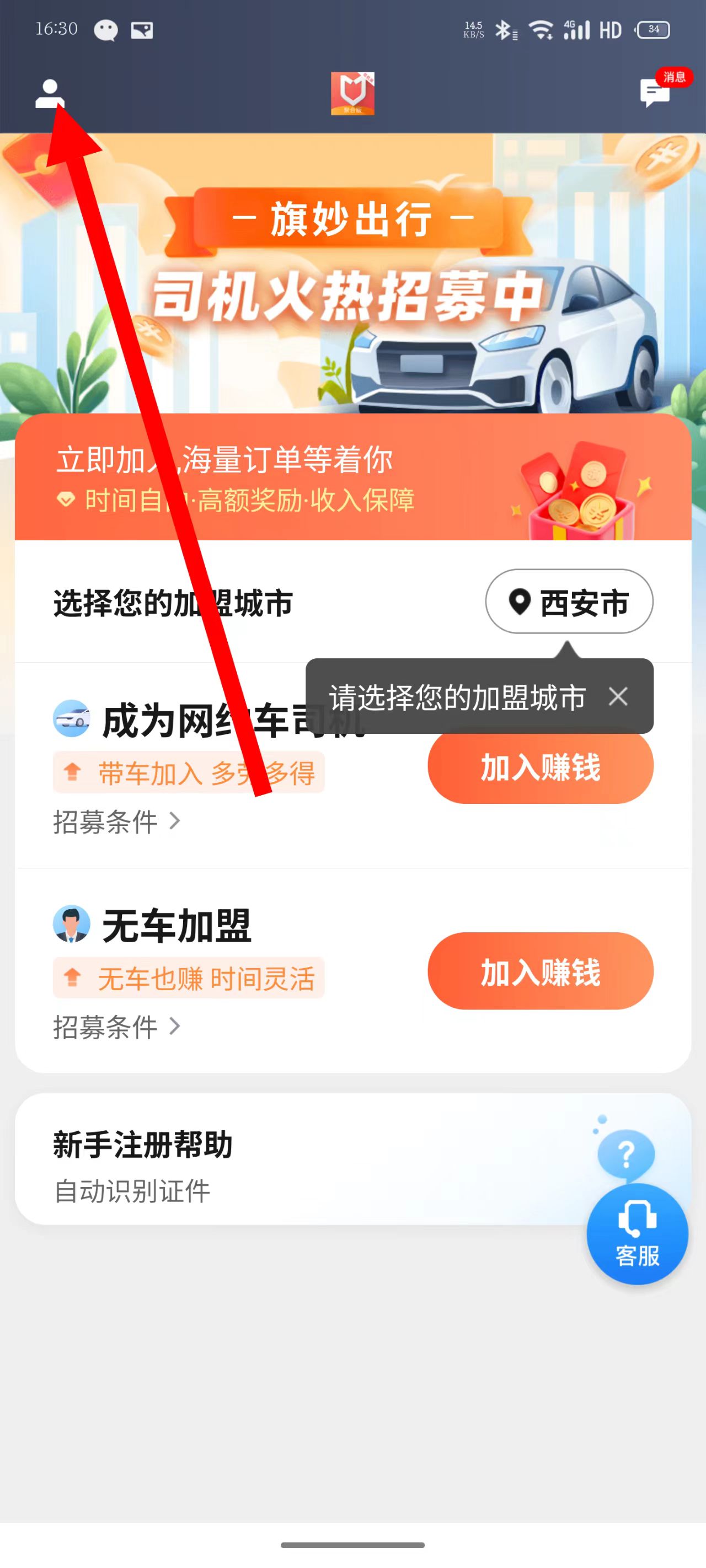 1、打開旗妙出行司機端聚合版,點擊左上角頭像圖標。
