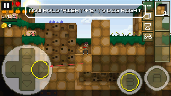 1、進(jìn)入游戲,根據(jù)提示NOWHOLDRIGHT+BTODIGRIGHT,點(diǎn)擊左下角方向鍵和右下角B鍵進(jìn)行挖掘。