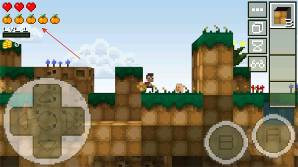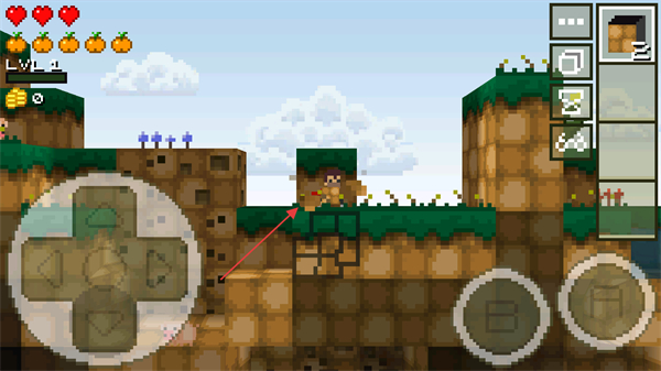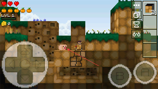 3、遇到小豬等生物時,小心躲避或利用道具應(yīng)對,避免角色受傷,注意左上角紅心代表的生命值。