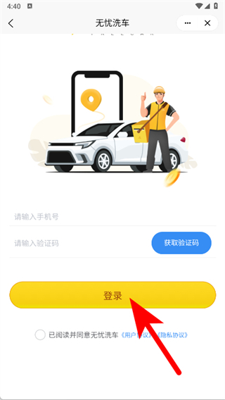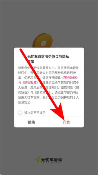 1、打開無憂車管家,在提示頁點(diǎn)擊同意。