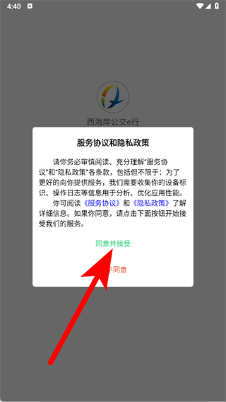 1、打開西海岸公交e行,在提示頁點(diǎn)擊同意并接受。