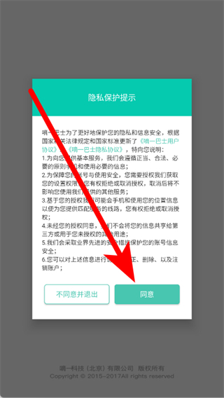 1、打開嘀一巴士,在隱私保護提示頁面點擊同意。