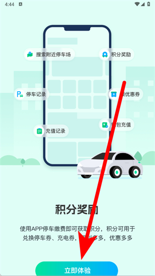 1、打開荊州停車,在積分獎勵引導頁面點擊立即體驗。
