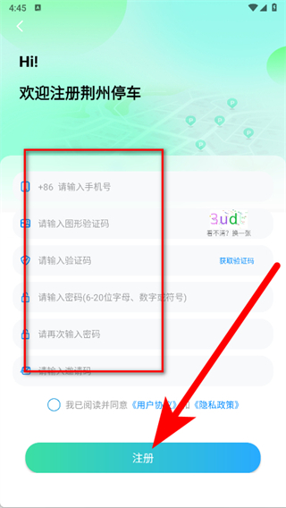 3、依次輸入手機號,輸入短信驗證碼等,點擊注冊按鈕,完成賬號注冊操作。