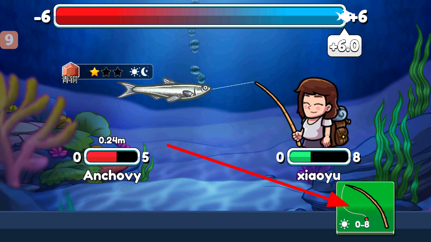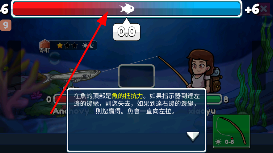 2、當(dāng)有魚咬鉤后,此時(shí)要留意魚的抵抗力指示器,魚會(huì)持續(xù)向左拉扯,需操控保持指示器在合適范圍,努力讓其到達(dá)右邊邊緣。