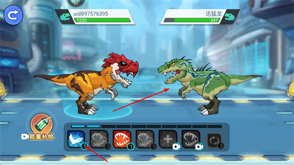 1、在對(duì)戰(zhàn)場(chǎng)景中,操控恐龍與其他恐龍進(jìn)行戰(zhàn)斗,點(diǎn)擊技能按鈕釋放技能,攻擊對(duì)手。