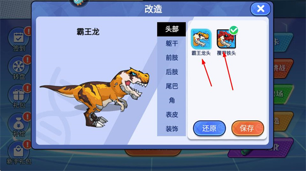 2、進(jìn)入改造界面,可對(duì)恐龍的頭部、軀干、四肢等部位進(jìn)行改造,打造獨(dú)特外觀,改造后點(diǎn)擊保存應(yīng)用更改。