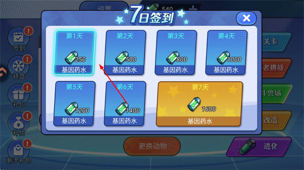 3、參與7日簽到活動(dòng),每日簽到可領(lǐng)取基因藥水等獎(jiǎng)勵(lì),積累資源用于恐龍的養(yǎng)成。