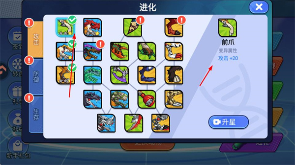 4、在進(jìn)化界面,可對(duì)恐龍的不同部位進(jìn)行進(jìn)化,提升屬性,還能進(jìn)行升星等操作,增強(qiáng)恐龍的戰(zhàn)斗力,助力對(duì)戰(zhàn)和養(yǎng)成。