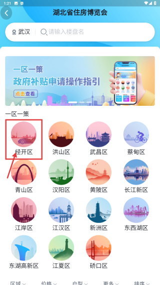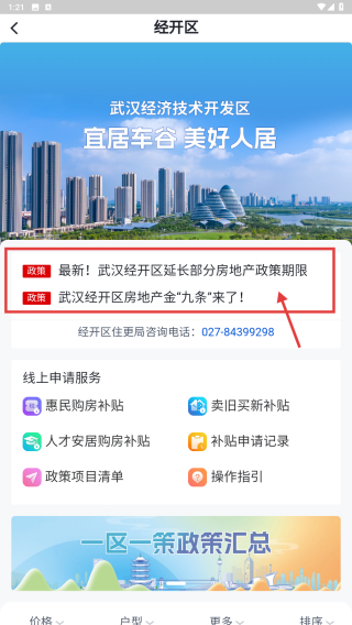 3、選擇經(jīng)開區(qū)區(qū)域,進(jìn)入該區(qū)域房產(chǎn)政策詳情頁。