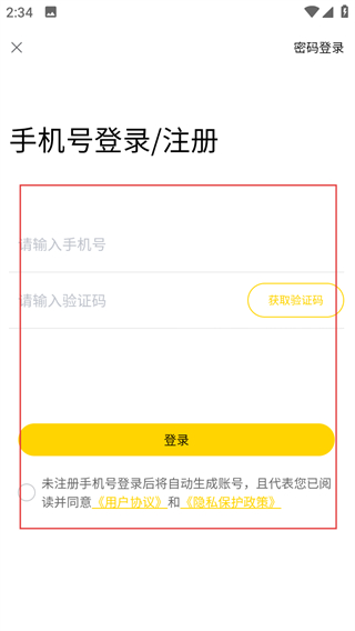4、在手機(jī)號(hào)登錄頁(yè)面,輸入信息勾選協(xié)議后,點(diǎn)擊登錄即可完成登錄。