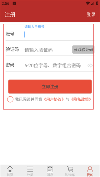 3、在注冊頁面,輸入信息勾選協(xié)議后,點擊立即注冊,即可完成注冊。