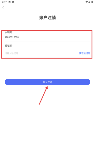 4、在賬戶注銷頁面,輸入手機號和驗證碼,點擊確認注銷按鈕,完成賬戶注銷操作。
