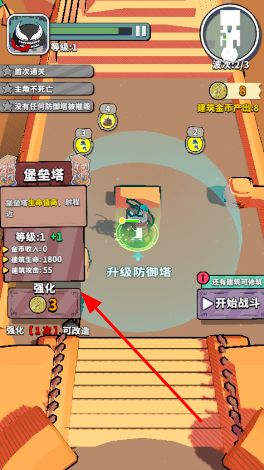 1、花費(fèi)金幣可對防御塔進(jìn)行升級強(qiáng)化,強(qiáng)化后的防御塔生命值、攻擊力等屬性會提升,能更有效地抵御敵人進(jìn)攻。