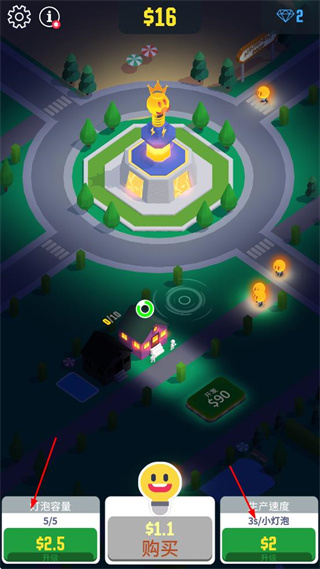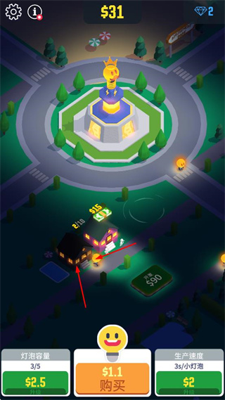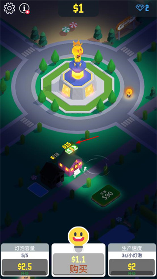 1、通過生產(chǎn)和收集小燈泡來獲取金幣,初始有生產(chǎn)設(shè)施,會(huì)自動(dòng)生產(chǎn)小燈泡。
