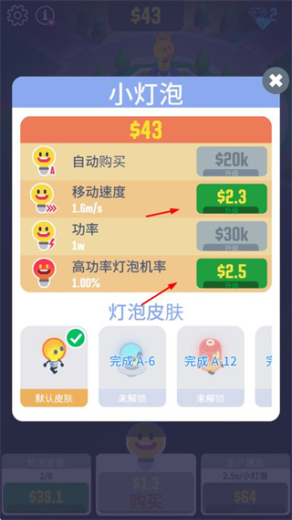 3、還可花費(fèi)金幣升級(jí)更多屬性,比如移動(dòng)速度、高功率燈泡機(jī)率,同時(shí)也能解鎖燈泡皮膚,豐富游戲體驗(yàn)。