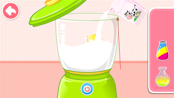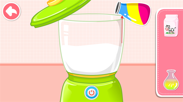 1、點(diǎn)擊屏幕將牛奶倒入綠色攪拌機(jī)中。
