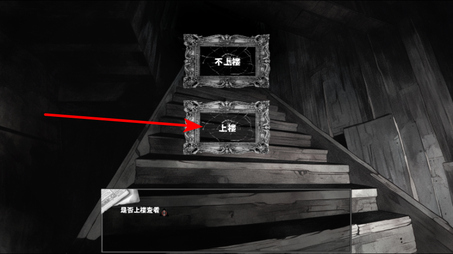2、選擇上樓選項(xiàng),探索老宅的上層區(qū)域,上層通常會(huì)有新的劇情節(jié)點(diǎn)或關(guān)鍵道具,是推進(jìn)關(guān)卡的必要步驟。