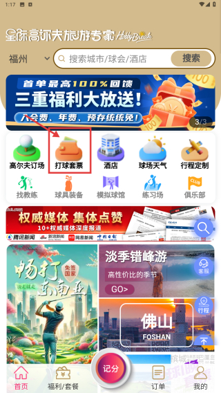 1、打開高爾夫旅游服務(wù)類應(yīng)用,點(diǎn)擊打球套票選項(xiàng),進(jìn)入精選打球行程頁面。