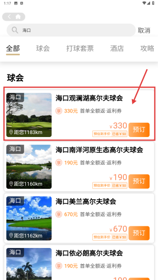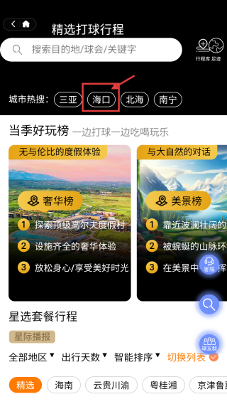 2、在精選打球行程頁面,選擇海口城市,進(jìn)入海口高爾夫球會列表頁面。