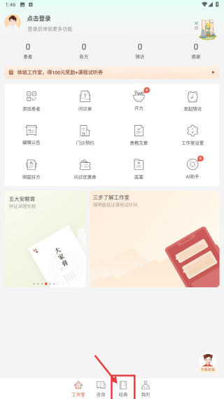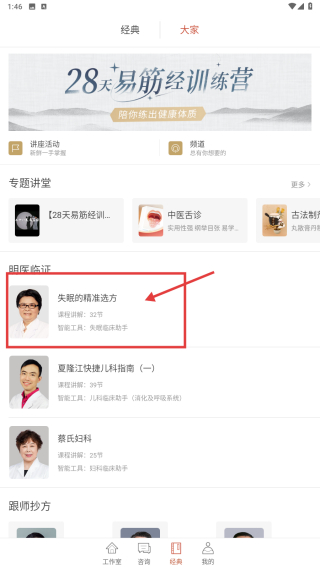1、打開(kāi)中醫(yī)學(xué)習(xí)類應(yīng)用,點(diǎn)擊底部經(jīng)典選項(xiàng),進(jìn)入經(jīng)典課程頁(yè)面。