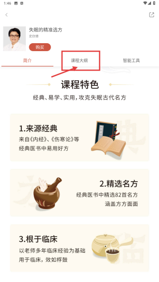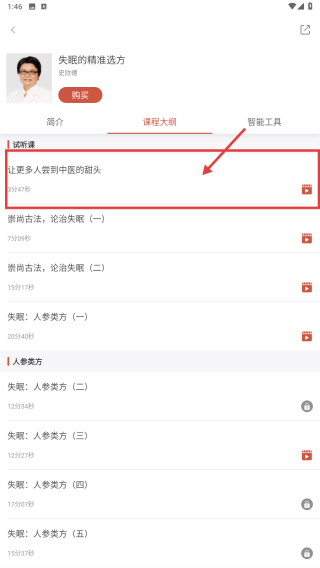 2、在經(jīng)典課程頁(yè)面,選擇失眠的精準(zhǔn)選方課程條目,進(jìn)入課程詳情頁(yè)面。