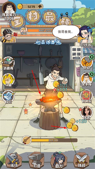 1、操控角色進行打鐵操作,每次打鐵可獲取金幣獎勵,同時積累打鐵的進度。