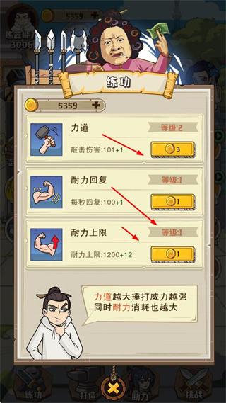2、可花費金幣升級各項屬性,如力道、耐力回復(fù)、耐力上限,增強打鐵的能力,讓打鐵更高效。