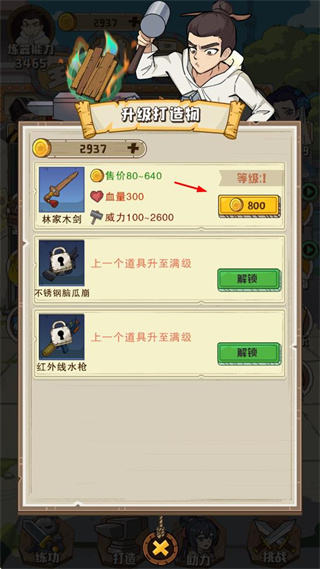 3、可花費金幣升級打造物,解鎖更高級的武器,提升武器的屬性,為后續(xù)的比拼等環(huán)節(jié)提供更強的裝備支持。