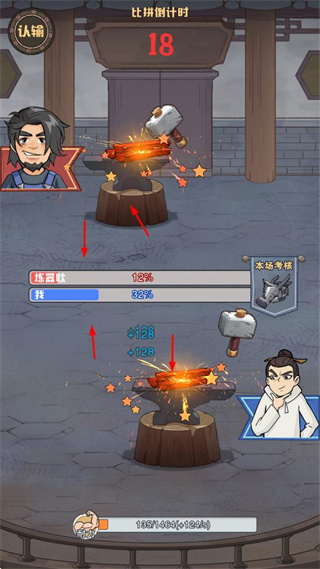 4、與其他角色進行打鐵比拼,通過快速打鐵積累進度,在比拼倒計時結(jié)束前,盡可能提升自己的進度占比。