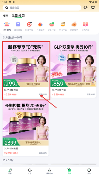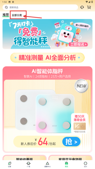 1、打開(kāi)體重管理類應(yīng)用,點(diǎn)擊底部商品選項(xiàng),進(jìn)入商品商城頁(yè)面。