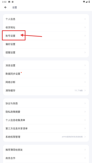 3、在設(shè)置頁面,點(diǎn)擊賬號(hào)設(shè)置選項(xiàng),進(jìn)入賬號(hào)設(shè)置界面。