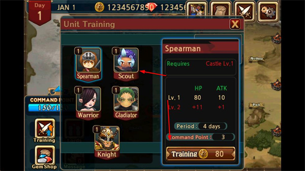 3、可訓練不同的兵種,訓練兵種需要滿足一定條件,花費金幣和時間,訓練完成后可獲得屬性提升的兵種。