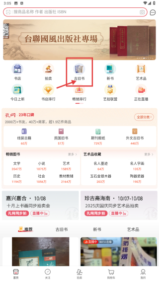 1、打開圖書電商應(yīng)用,點(diǎn)擊古舊書分類,進(jìn)入古舊書頁面。