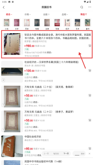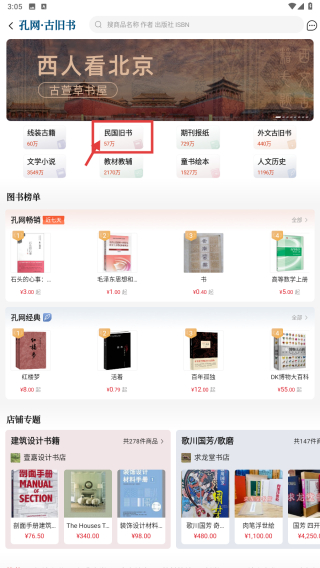 2、在古舊書頁面,選擇民國圖書分類,進(jìn)入民國圖書列表頁面。