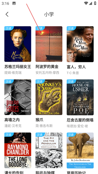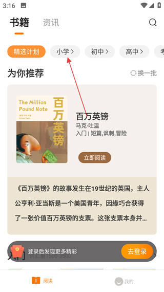 1、進入蘿卜閱讀首頁,點擊小學(xué),進入小學(xué)書籍列表頁面。