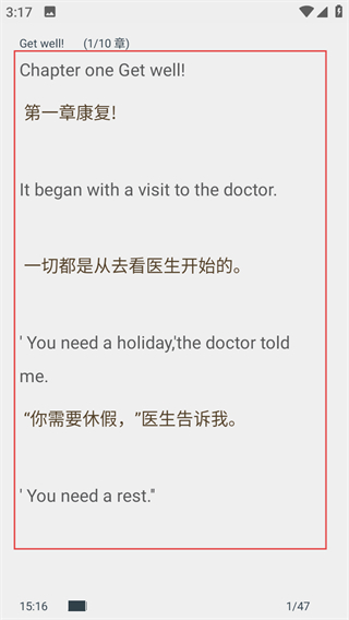 3、雙語對照閱讀:每本讀物均提供中文與英文對照版本,用戶可隨時切換查看,遇到陌生詞匯或復(fù)雜句式時,能通過中文釋義快速理解,降低閱讀難度,提升學(xué)習(xí)效率。