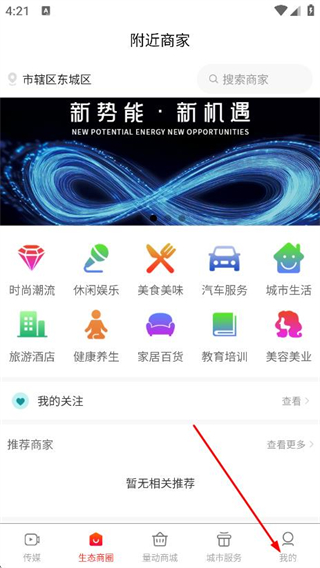 1、在附近商家的頁(yè)面,點(diǎn)擊底部我的,進(jìn)入頁(yè)面。