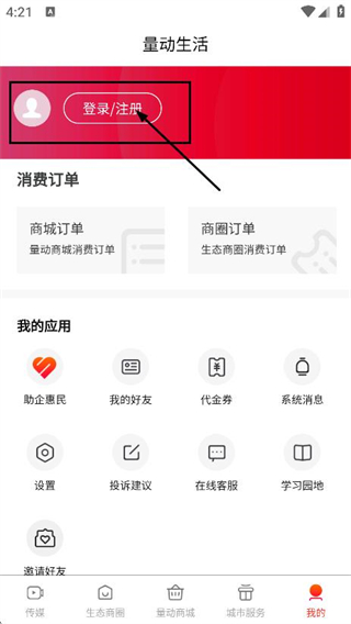 2、在量動(dòng)生活的頁(yè)面,點(diǎn)擊登錄注冊(cè),進(jìn)入登錄頁(yè)面。
