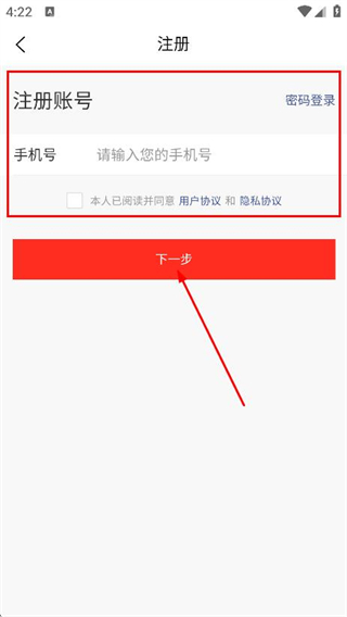 4、在注冊(cè)頁(yè)面,填寫(xiě)手機(jī)號(hào),點(diǎn)擊下一步,進(jìn)行注冊(cè)操作。