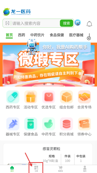 1、打開龍一醫(yī)藥應(yīng)用,點擊底部分類選項,進(jìn)入藥品分類頁面。