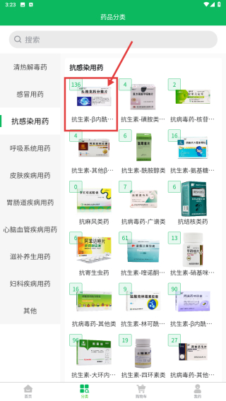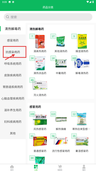2、在藥品分類頁面,選擇抗感染用藥分類,進(jìn)入抗感染用藥列表頁面。