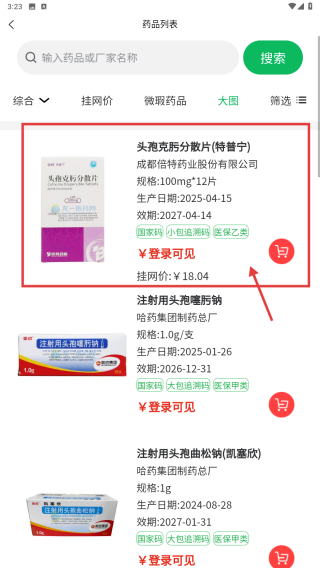 3、選擇頭孢克肟分散片特普寧藥品條目,進(jìn)入藥品詳情頁面。