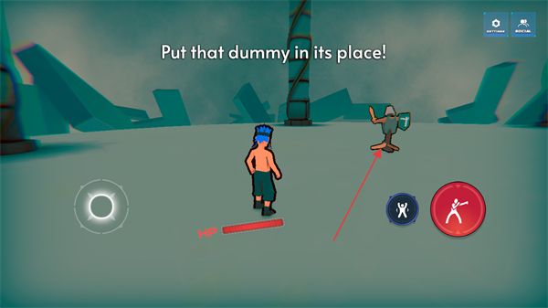 3、遇到如假人之類的目標(biāo)時(shí),靠近目標(biāo)后點(diǎn)擊攻擊按鈕,按提示Put that dummy in its place!對(duì)目標(biāo)進(jìn)行擊打。