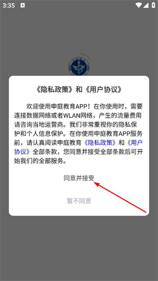 1、在用戶協(xié)議彈窗中,點(diǎn)擊同意并接受,進(jìn)入首頁(yè)。