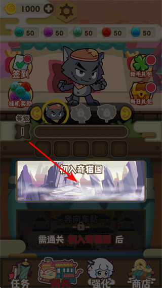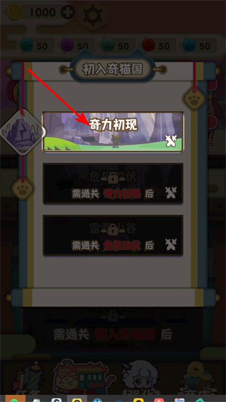 1、選擇初入奇貓國關(guān)卡,這是游戲的初始關(guān)卡,完成后可解鎖后續(xù)關(guān)卡,開啟奇貓國冒險之旅。