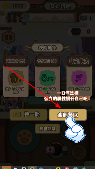 3、點(diǎn)擊全部領(lǐng)取技能獎勵,一次性獲取閃避提升、攻擊速度提升和生命回復(fù)等強(qiáng)力屬性加成。
