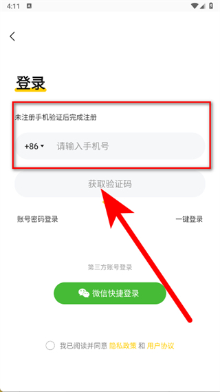 3、在登錄頁面,輸入手機(jī)號,勾選后,點(diǎn)擊獲取驗證碼。