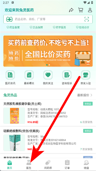 1、打開(kāi)兔靈醫(yī)藥APP,點(diǎn)擊底部醫(yī)生選項(xiàng)。