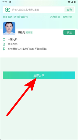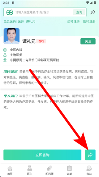 3、進(jìn)入醫(yī)生詳情頁(yè)后,點(diǎn)擊頁(yè)面右下角的分享圖標(biāo)。